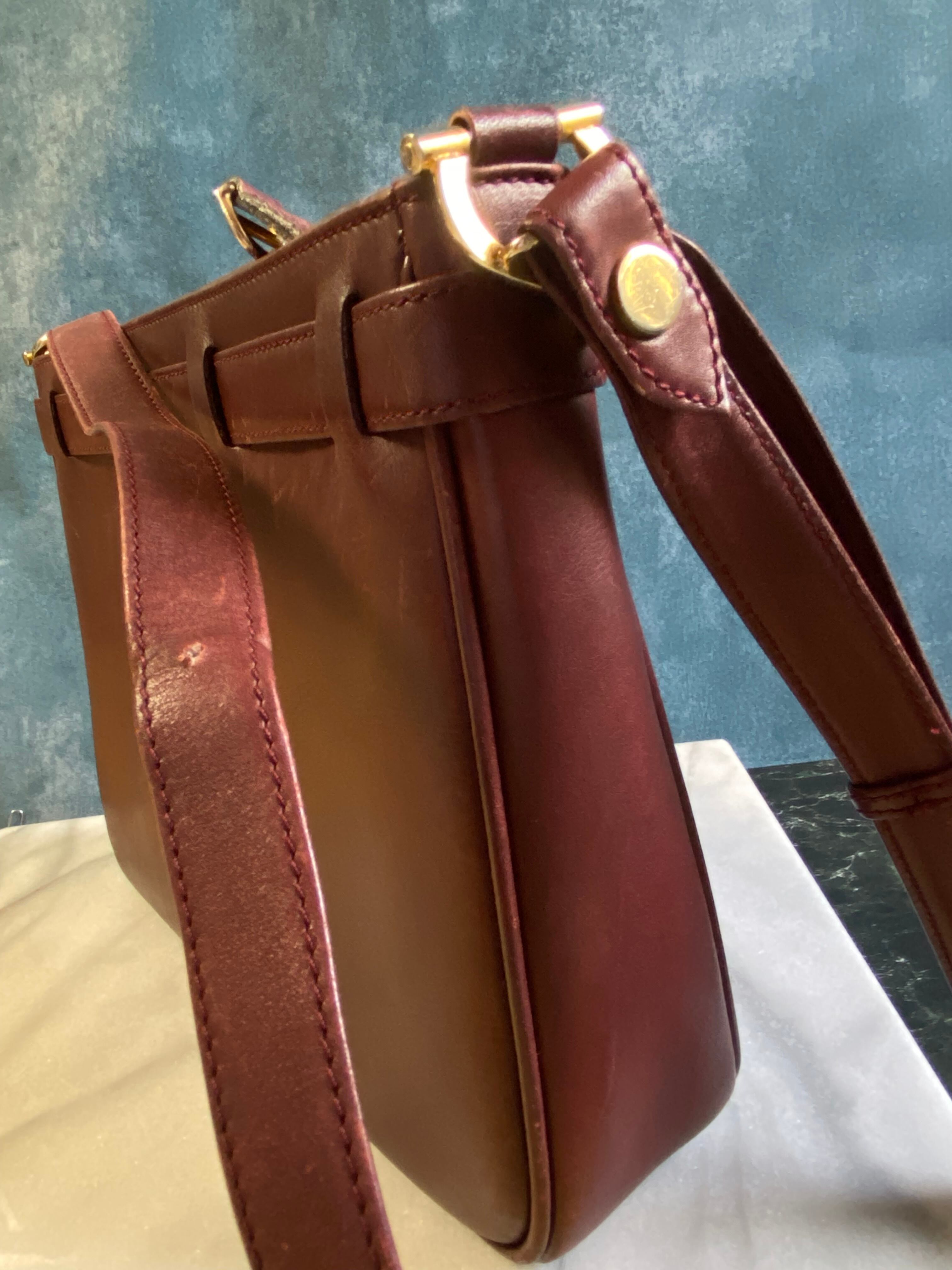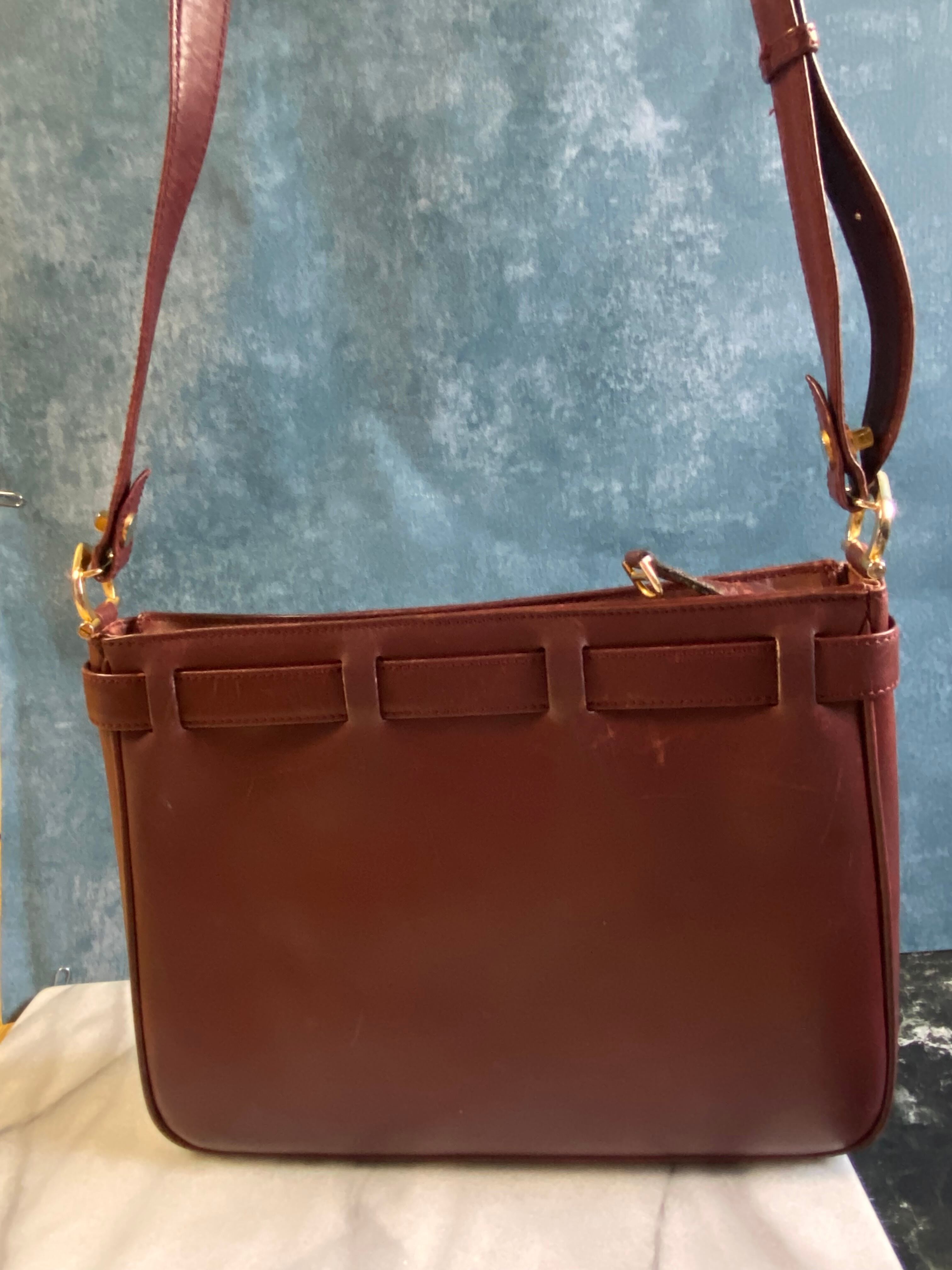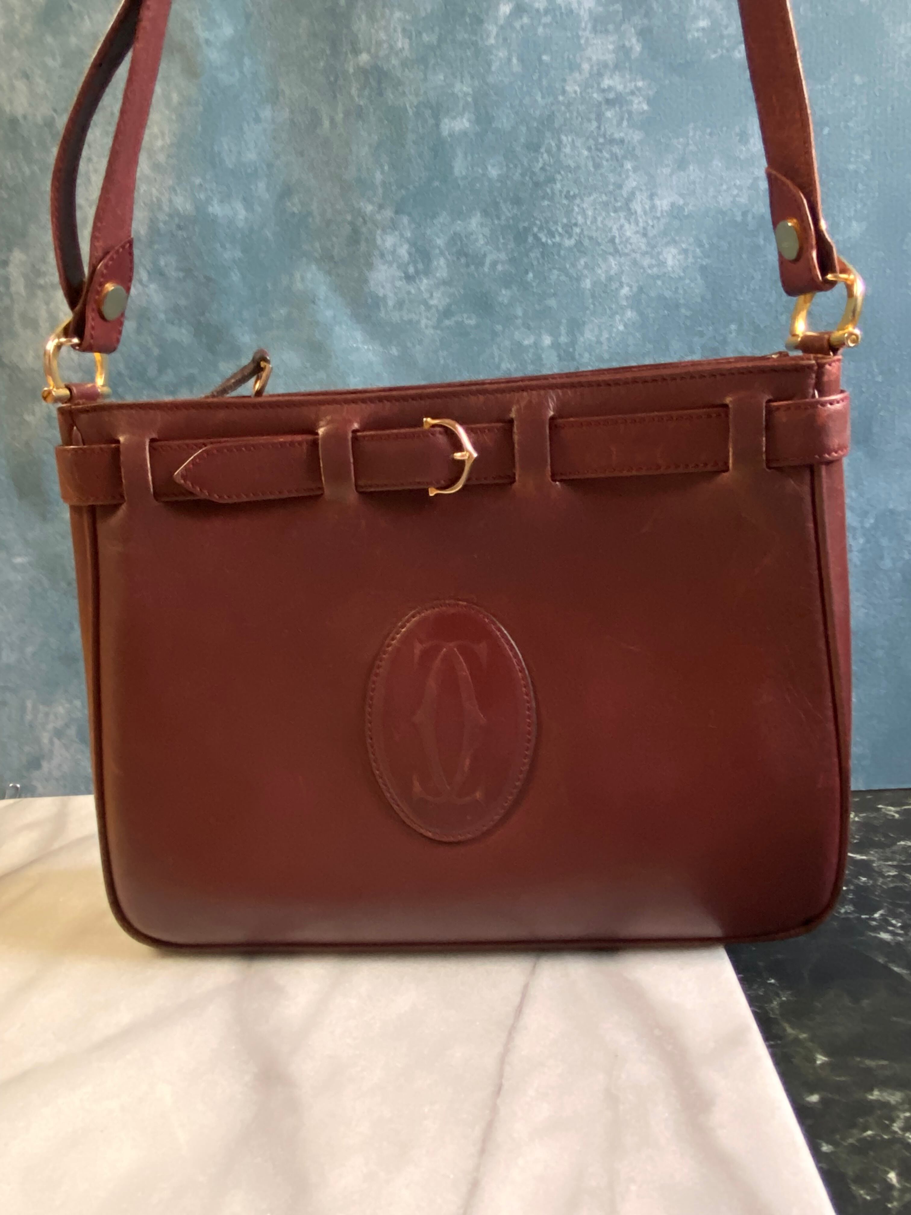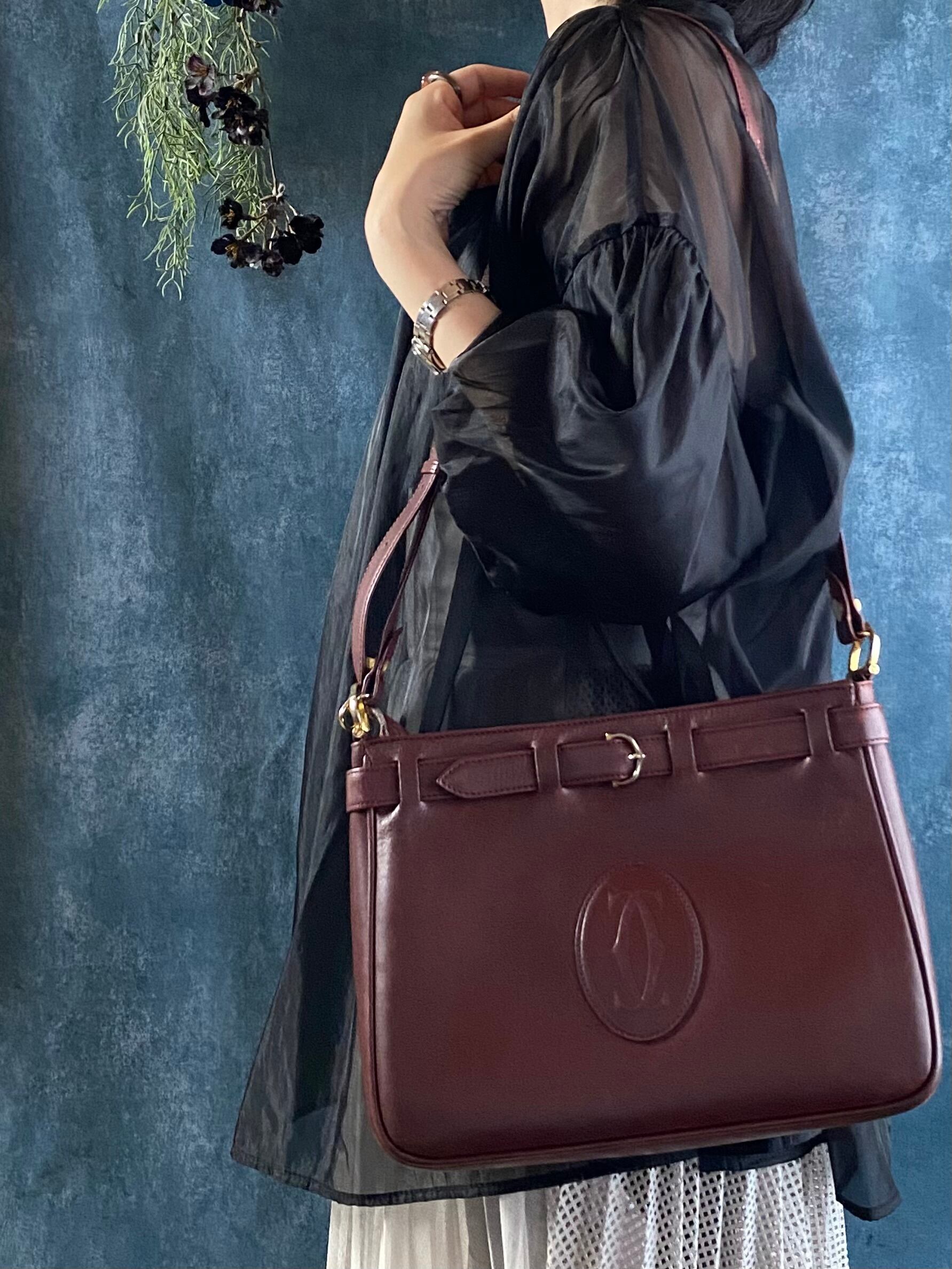 高級ブランド、Cartier(カルティエ)のマスト カーフレザー ショルダーバッグは、ヴィンテージの風合いが魅力的なアイテムです。カーフレザーを使用しているため、しっかりとした作りでありながら、上品な光沢感があります。ボルドーのカラーは大人の上品さを演出しカルティエのシンボルであるストラップバックル、ディテールも素晴らしいところです。 お洒落な外見だけでなく、縫い目や金具類にも細かいところまで丁寧な仕上がりになっていてヴィンテージということもあり、どこか違う雰囲気を持った特別な一品です。 カジュアルな服装にも、きちんとした装いにも相性が抜群です。