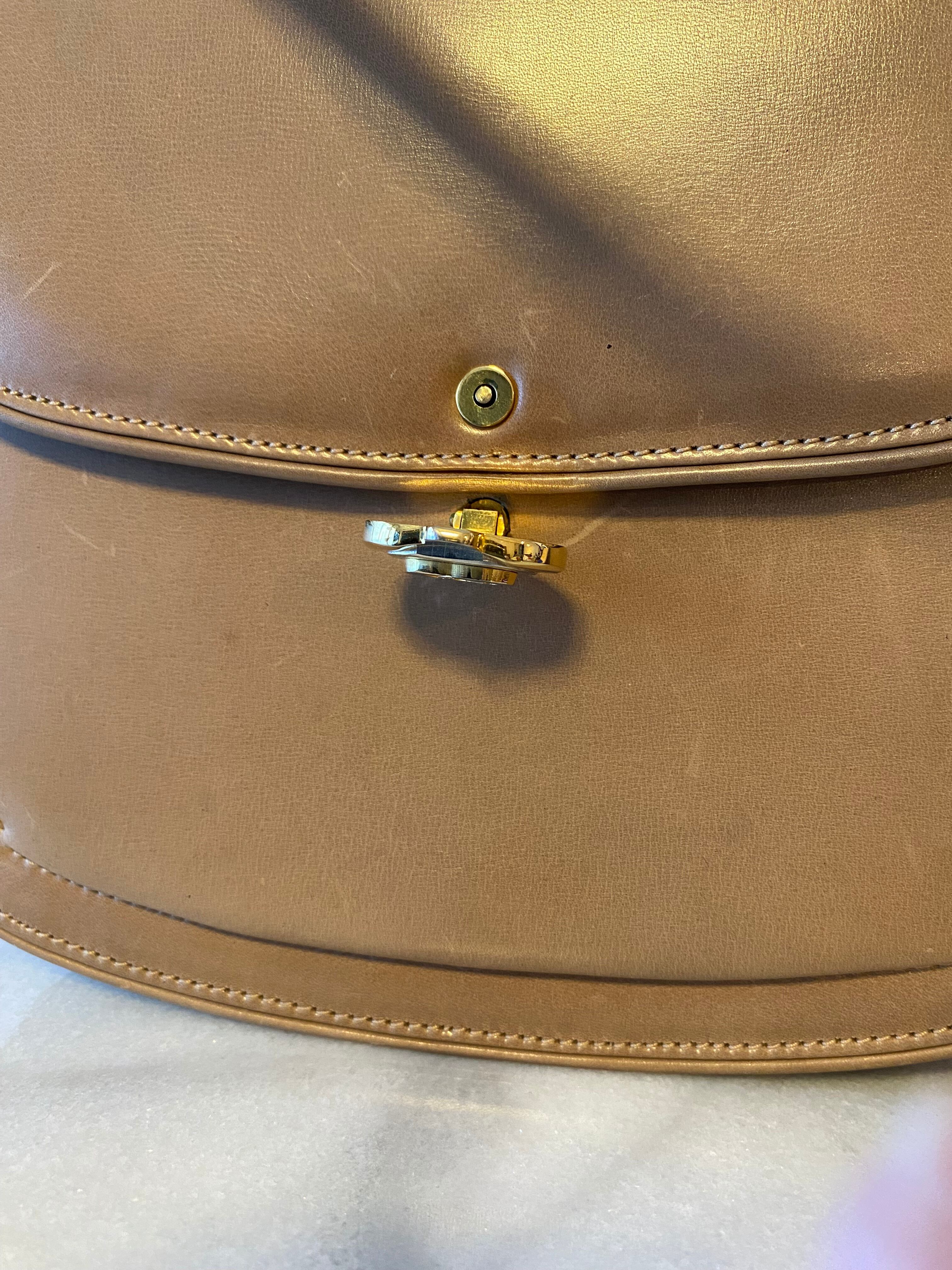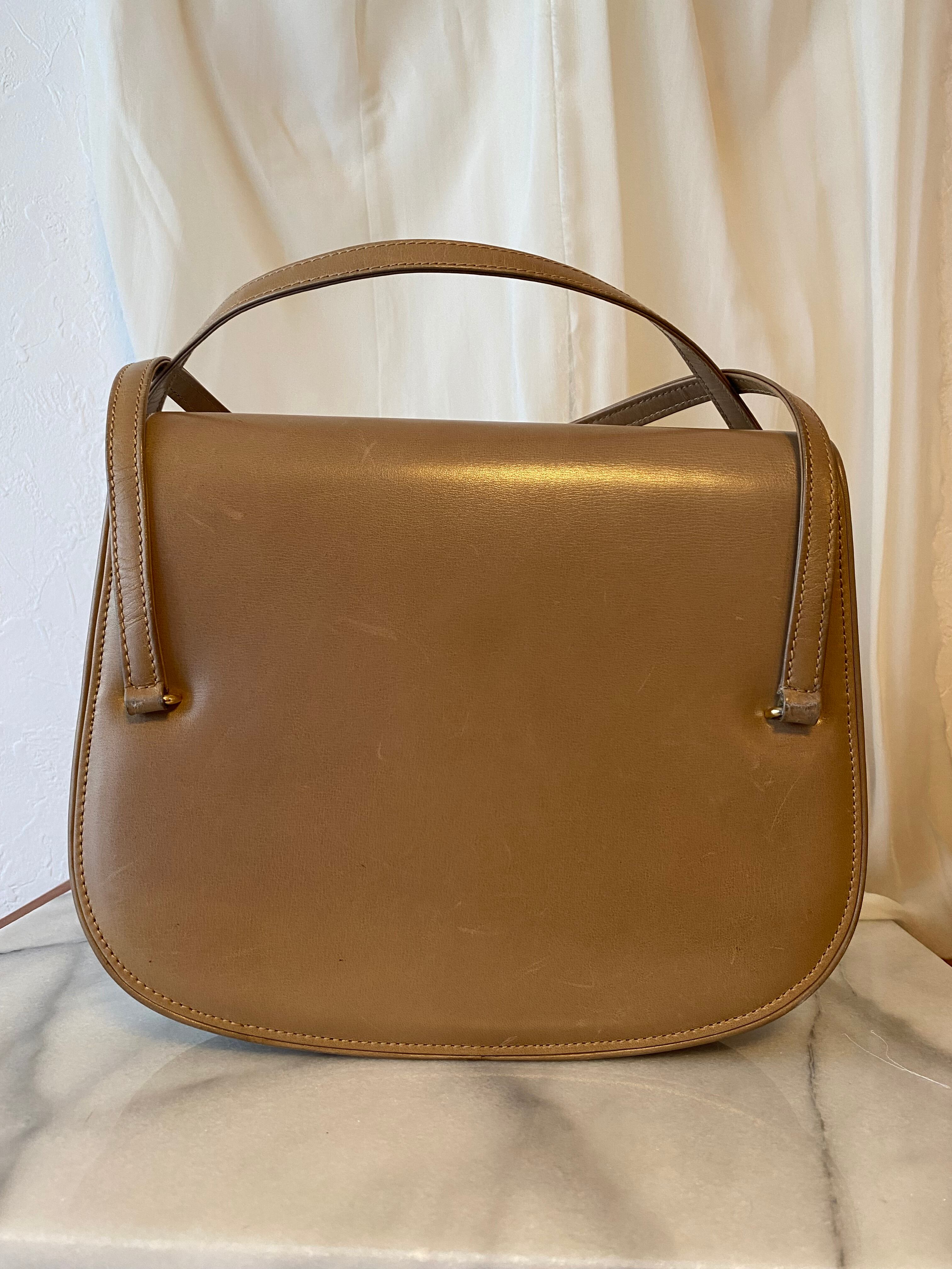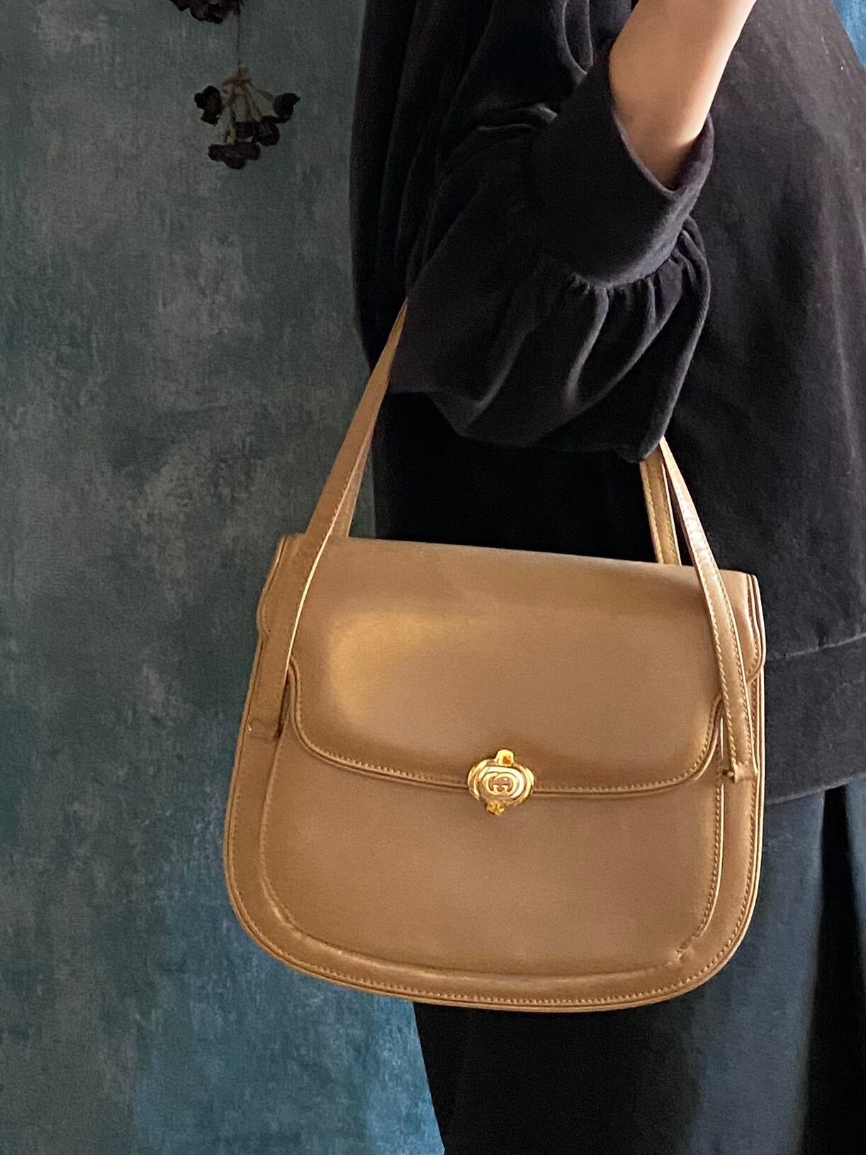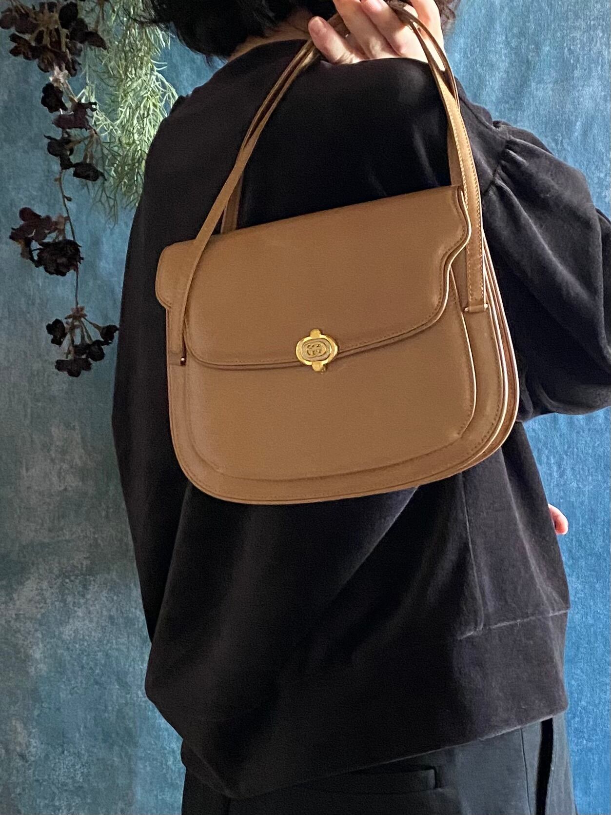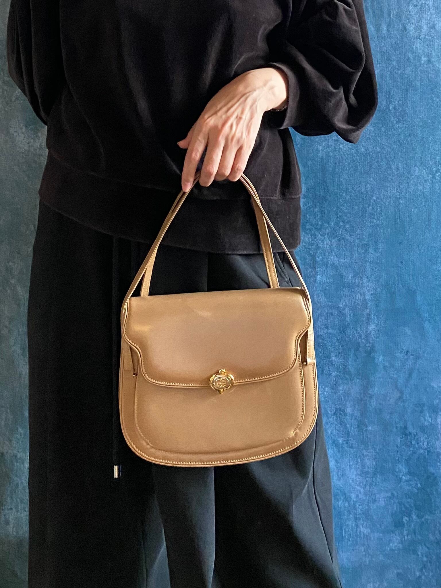 エレガントで上品なオールドグッチ GG金具 レザーハンドバッグです。ベージュの色味が落ち着いており、どんなシーンにもマッチするアイテムです。丸みを帯びた形状が女性らしさを引き立て、持ち手の金具が高級感を演出しています。