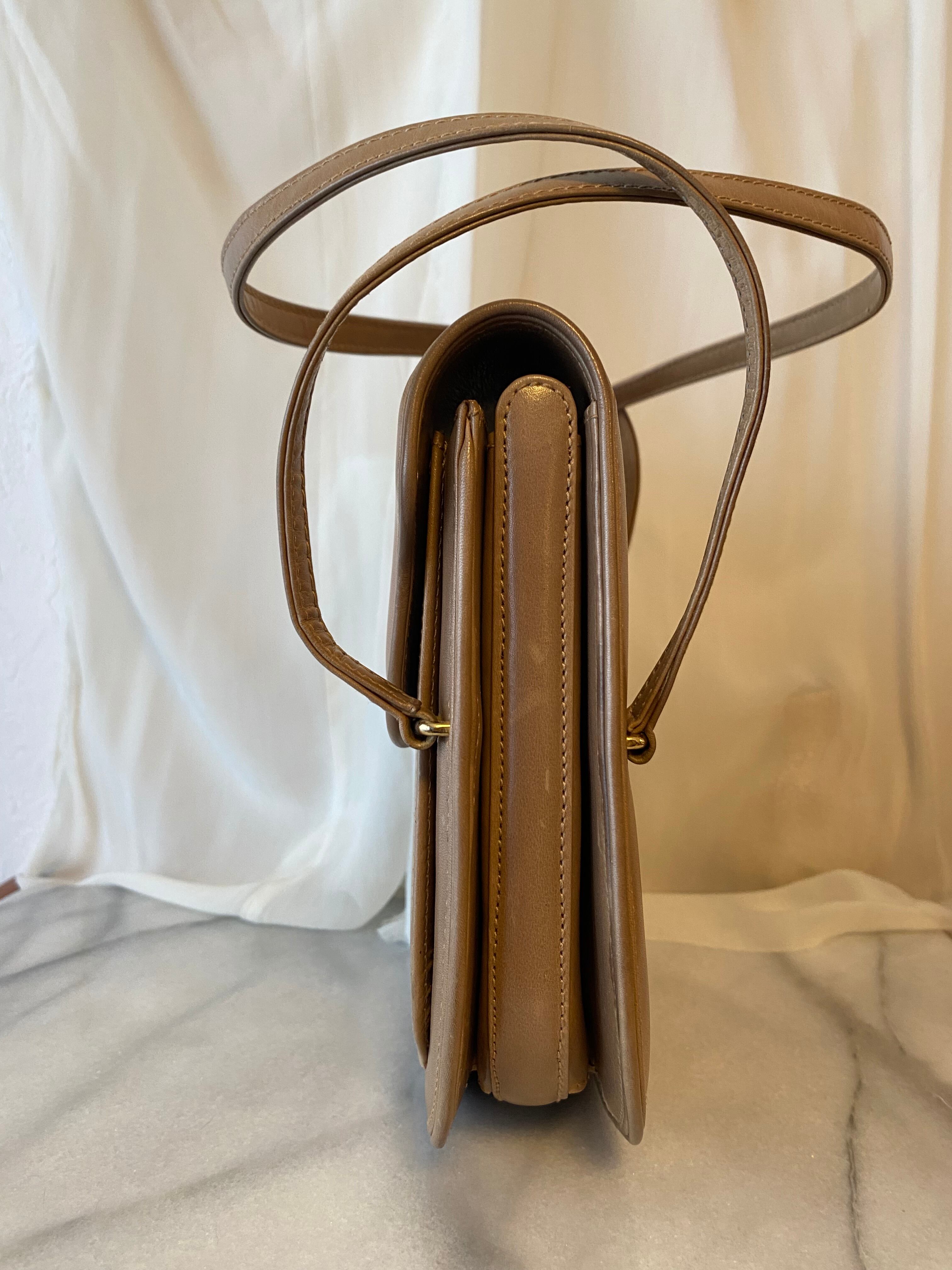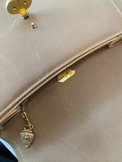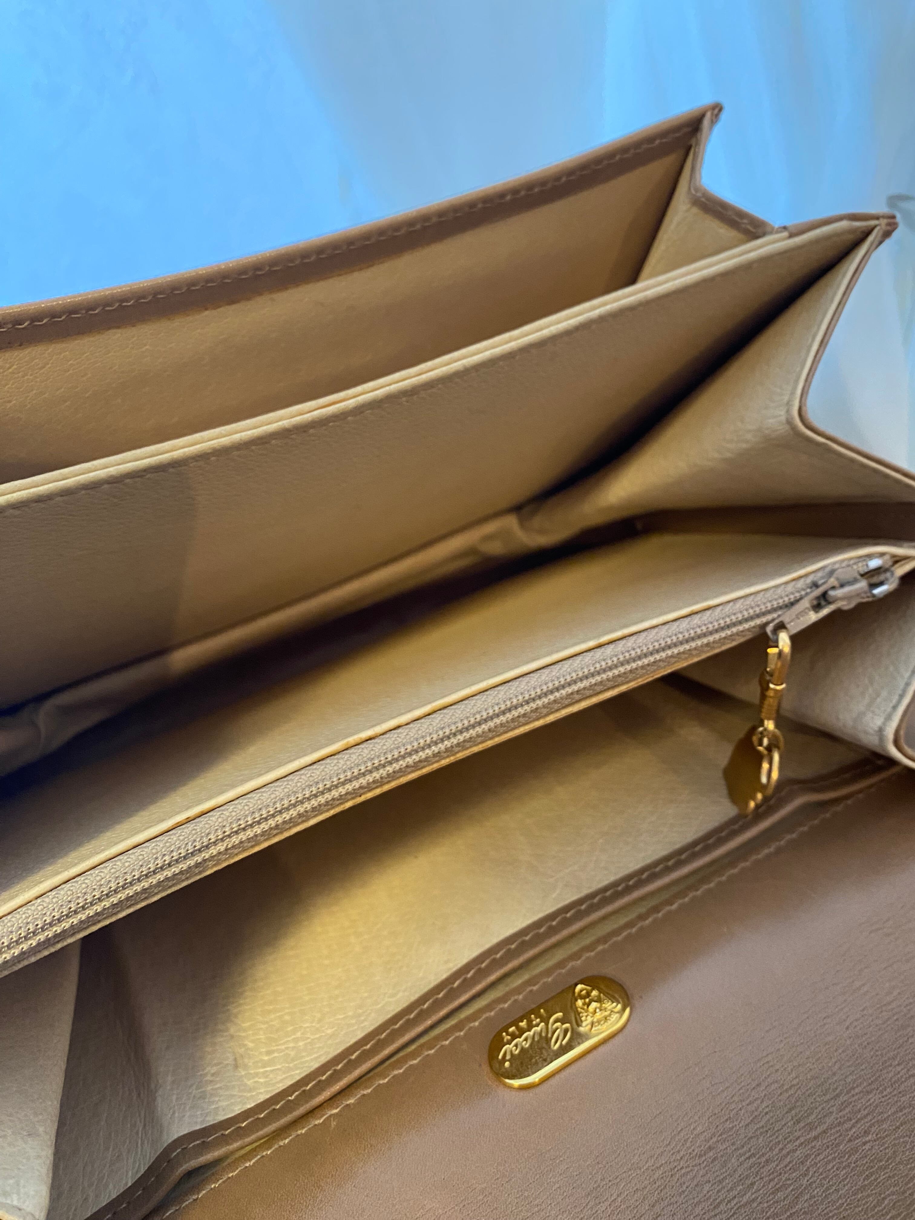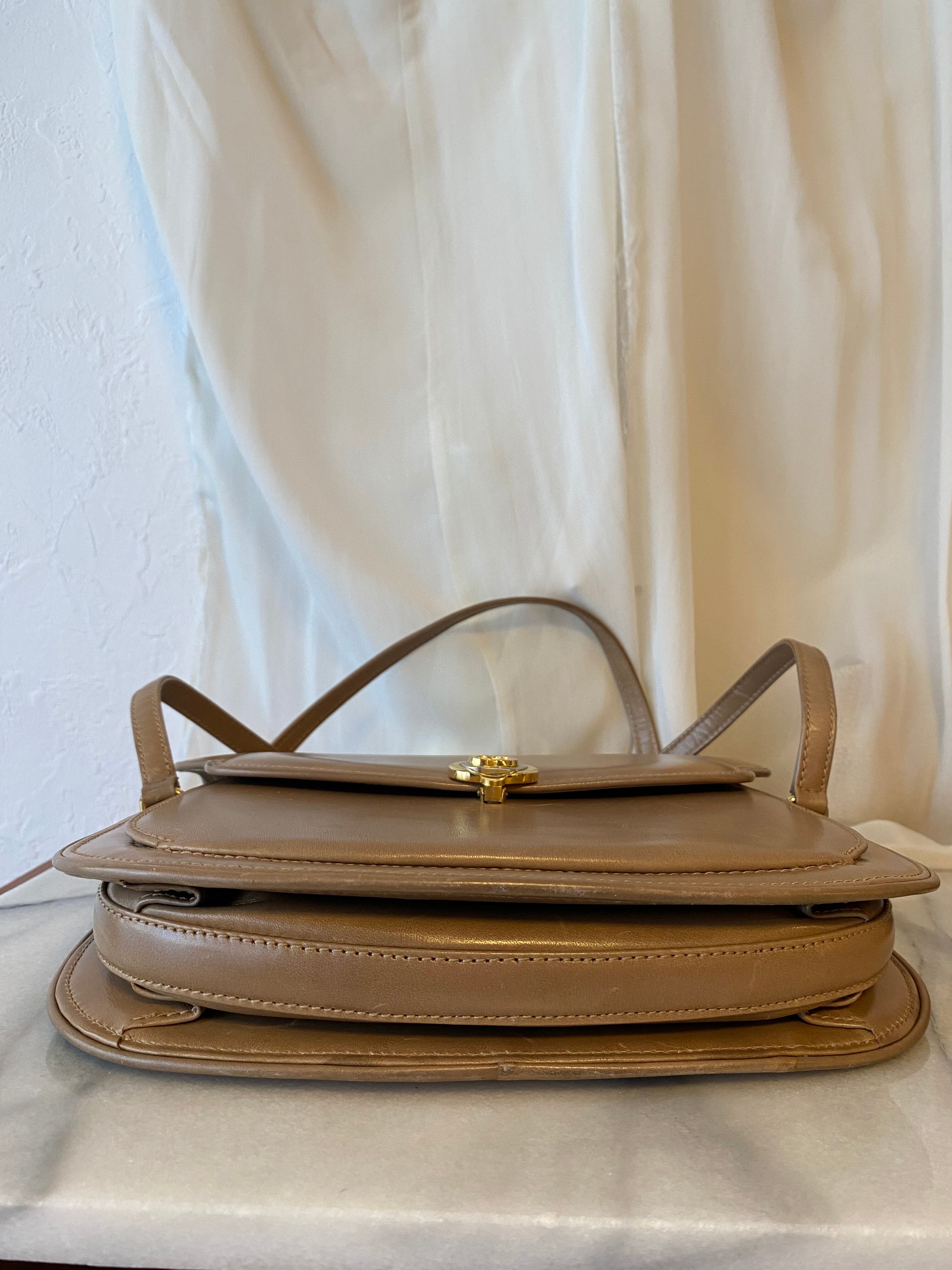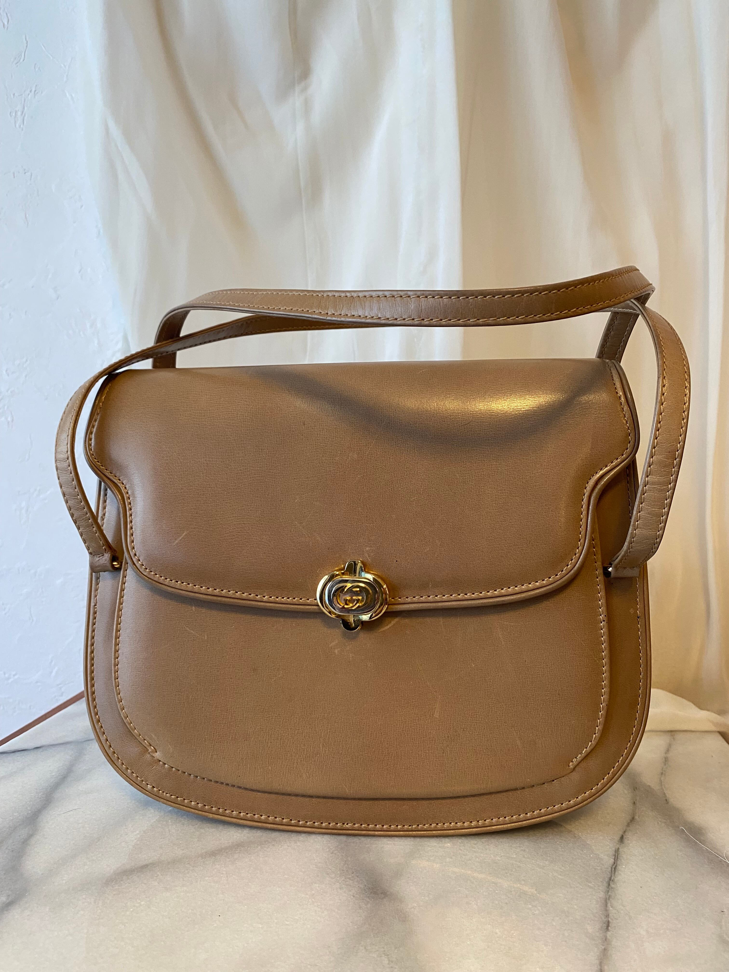 エレガントで上品なオールドグッチ GG金具 レザーハンドバッグです。ベージュの色味が落ち着いており、どんなシーンにもマッチするアイテムです。丸みを帯びた形状が女性らしさを引き立て、持ち手の金具が高級感を演出しています。