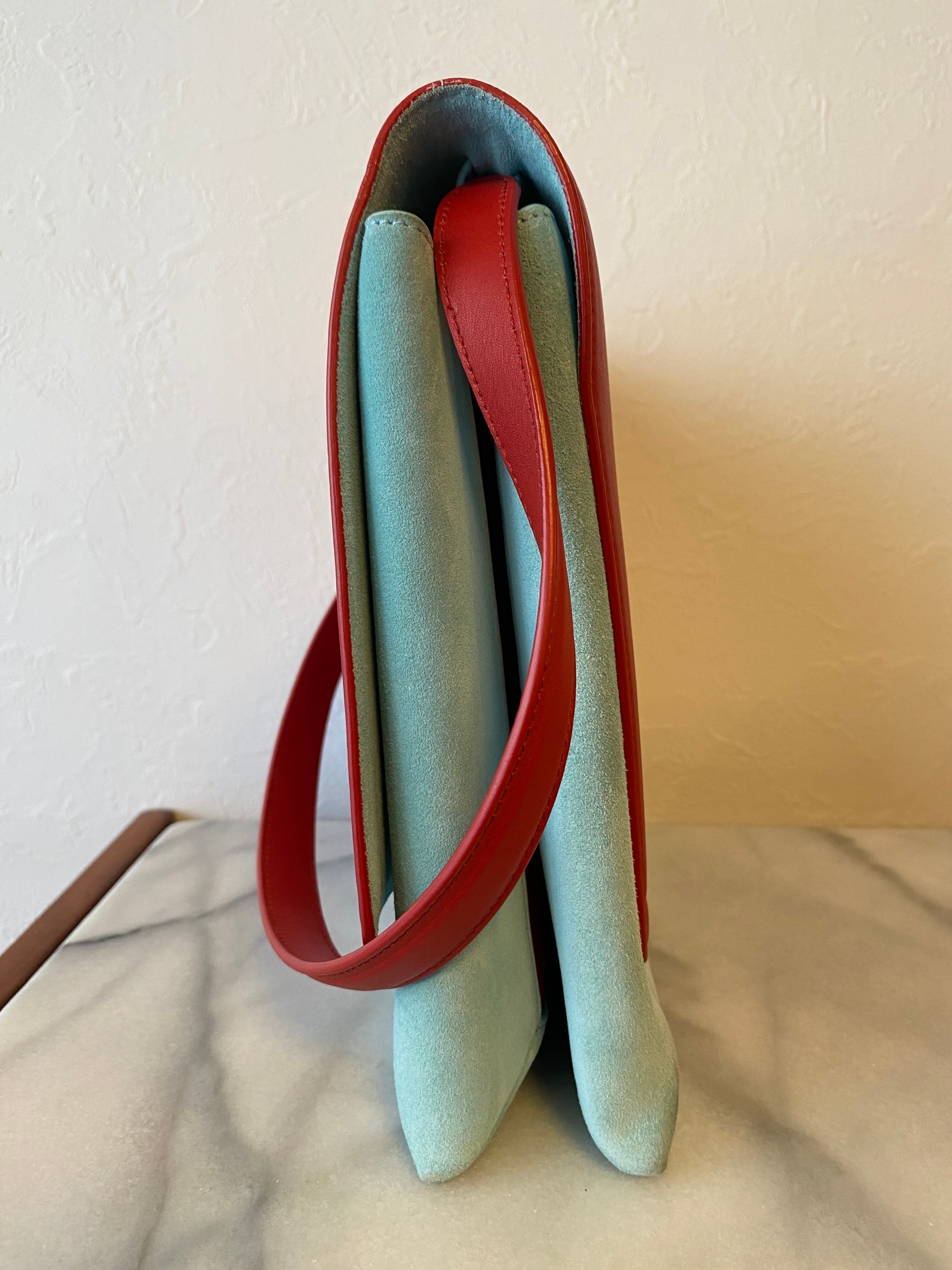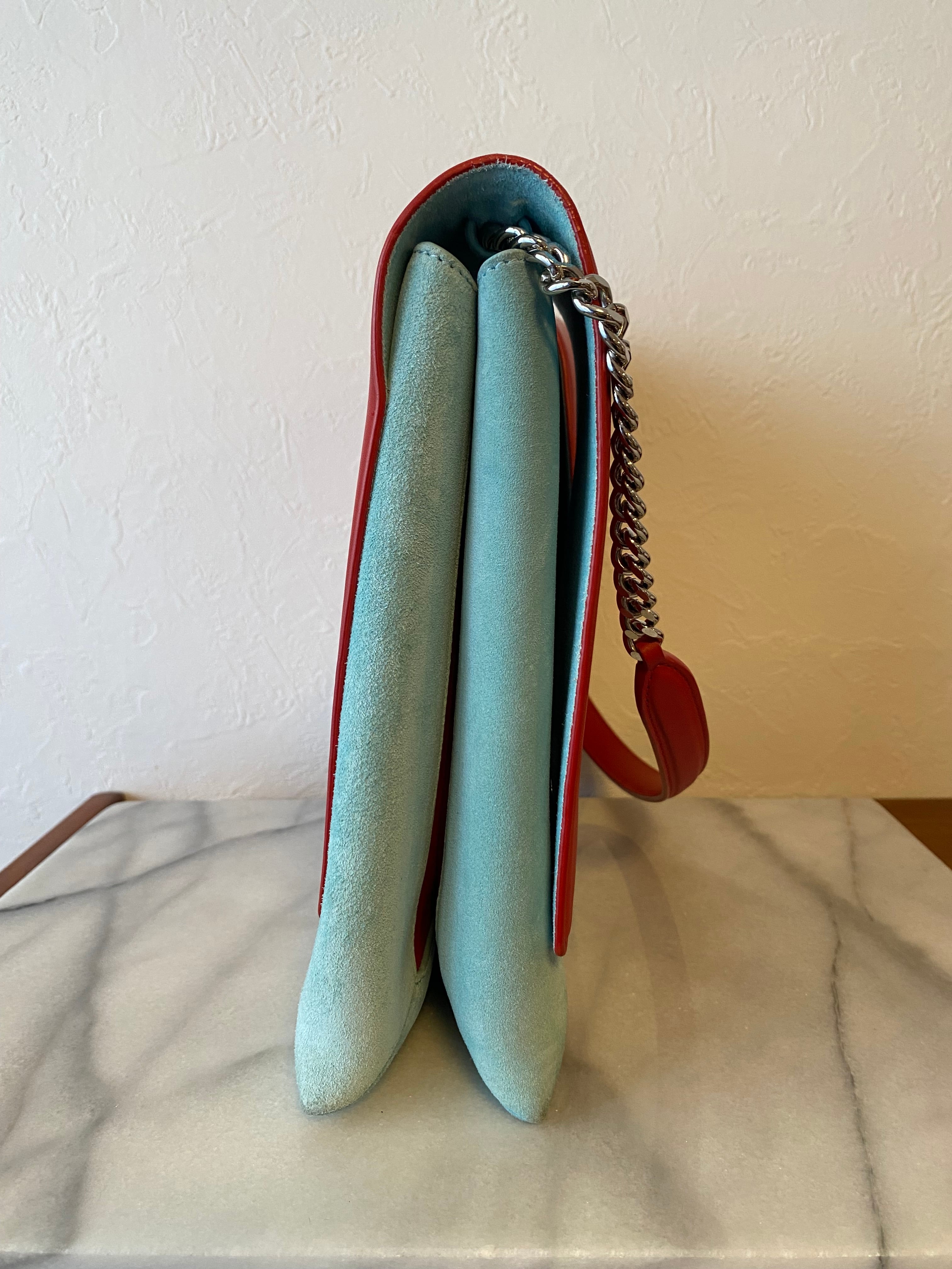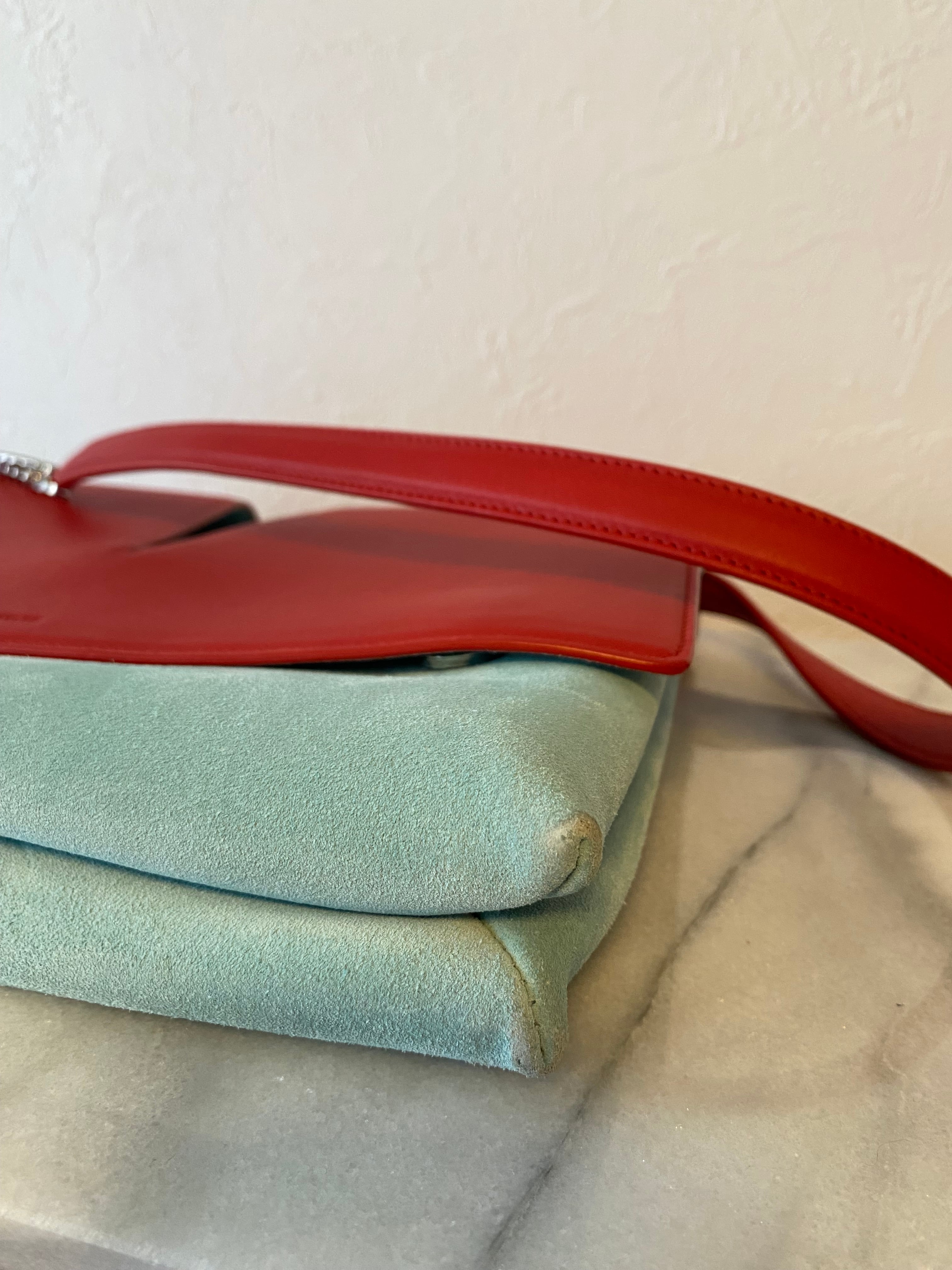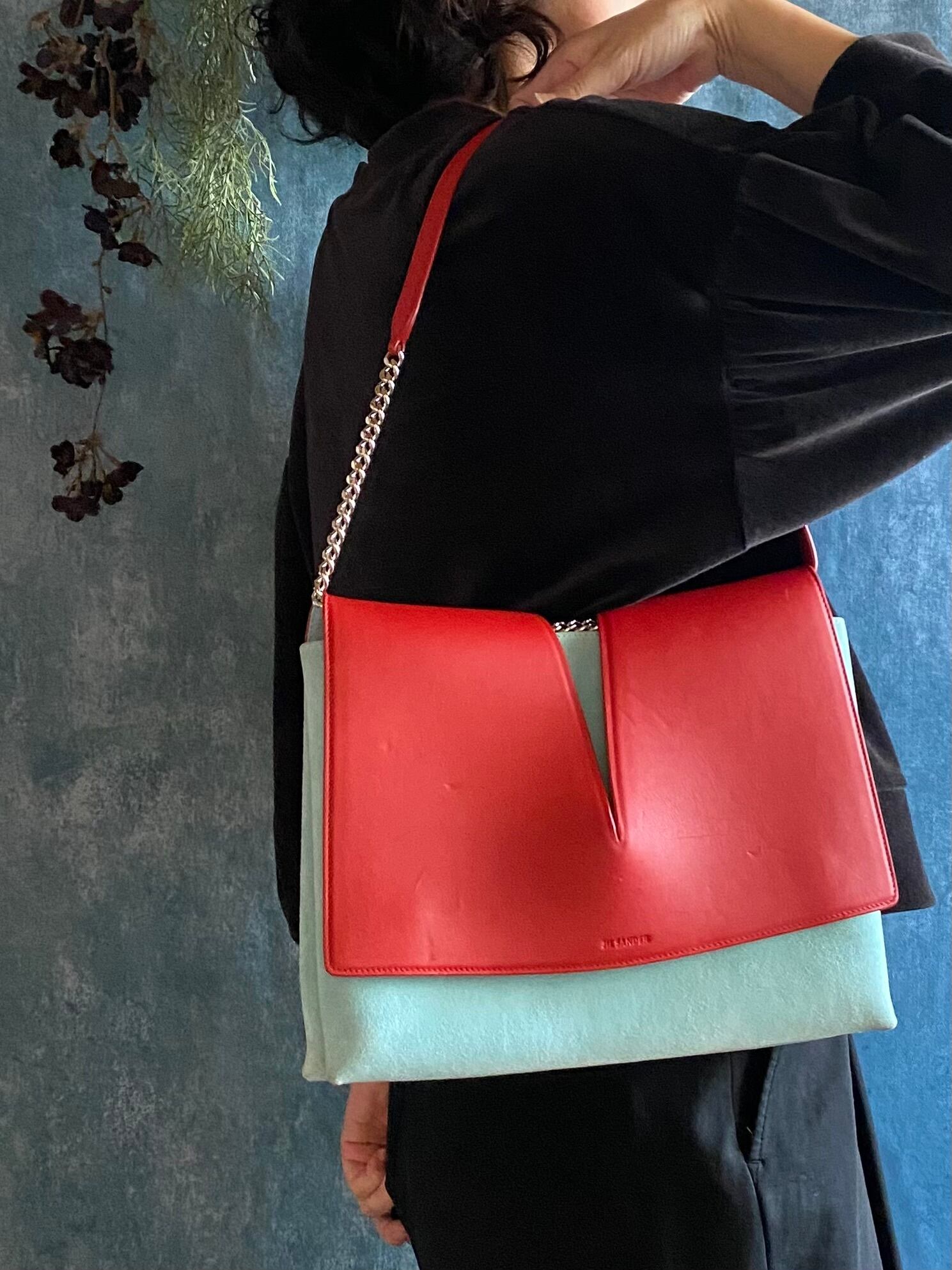 Jil Sanderのレザー×スウェードのチェーンショルダーバッグです。上品で洗練されたデザインが魅力の一品です。レッドとベビーブルーの2色展開で、どちらもコーディネートに華やかさをプラスしてくれます。クラッチバッグの様に持っても様になり、幅広いシーンで活躍してくれます。ショルダーのシルバーチェーンがよりスタイリッシュなデザインです。