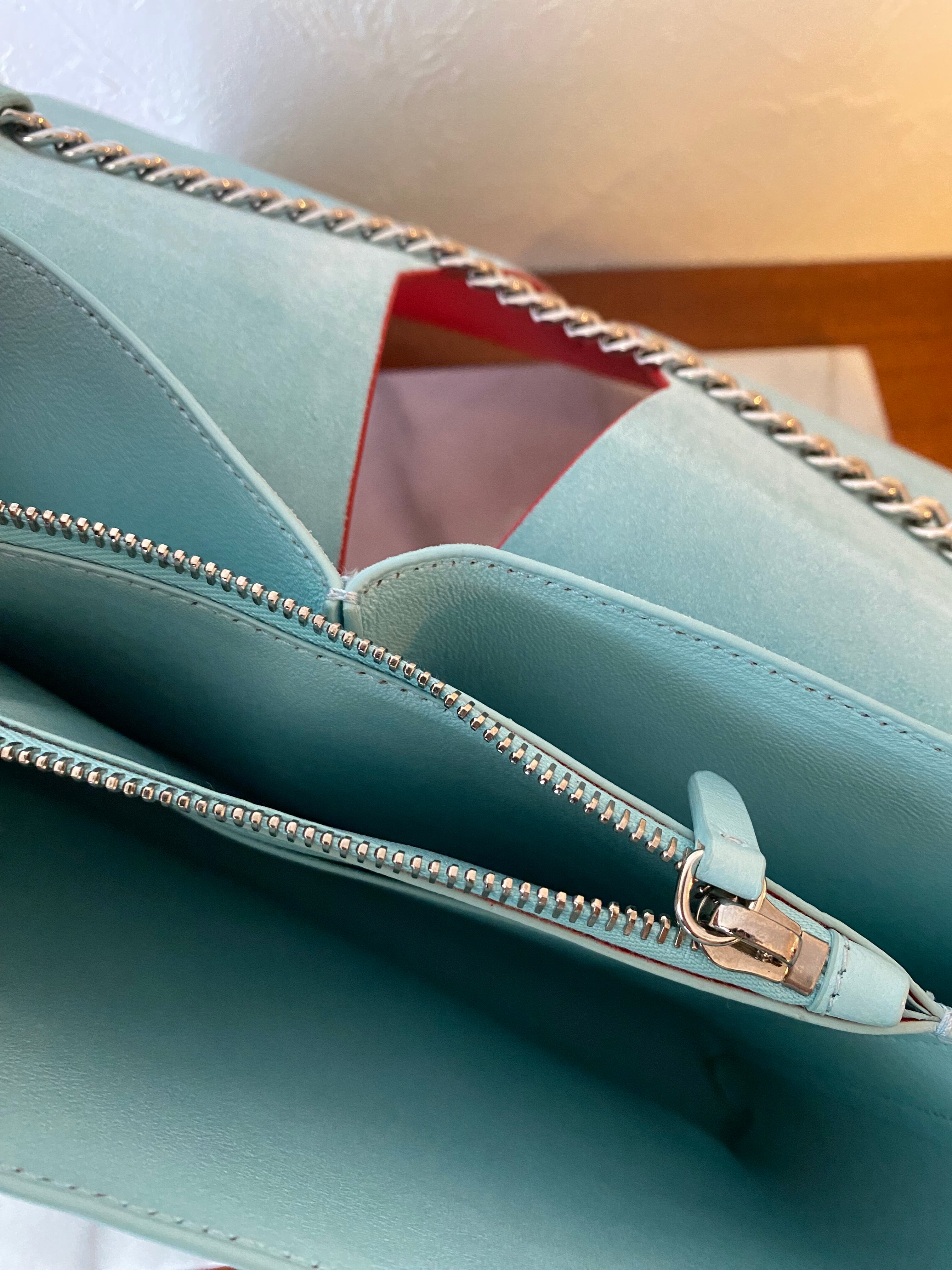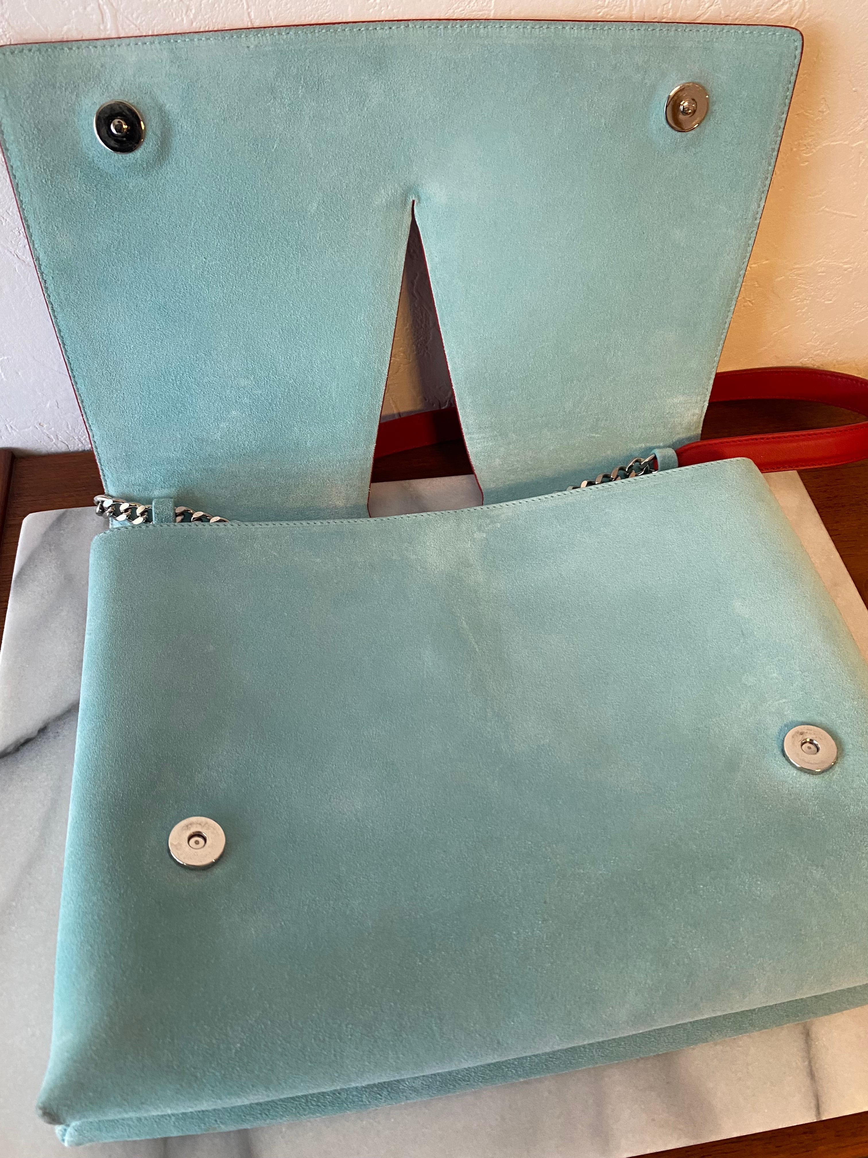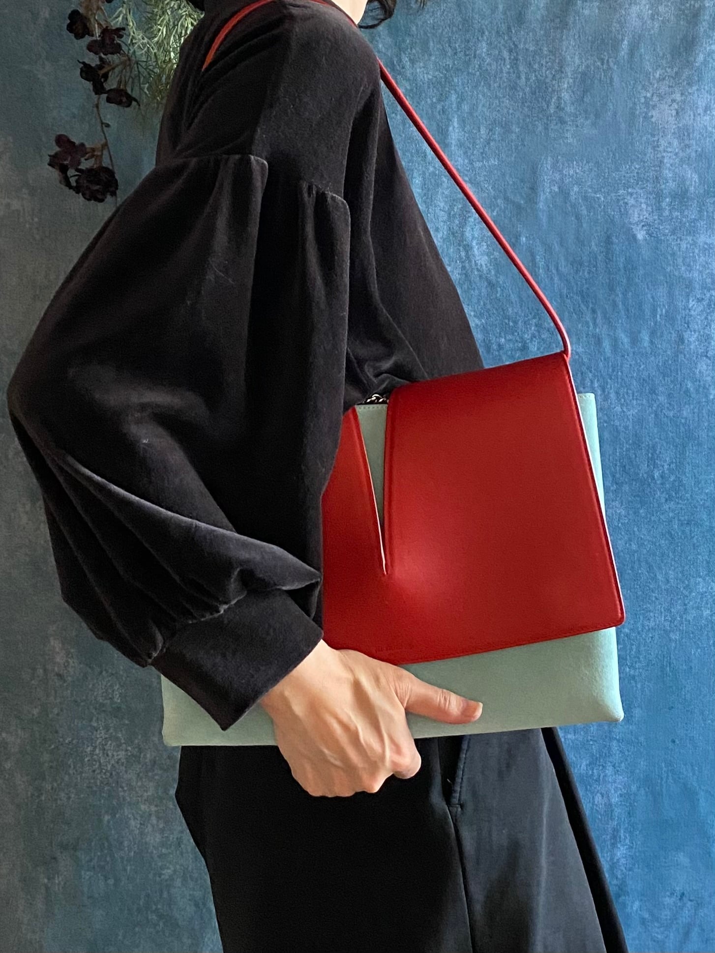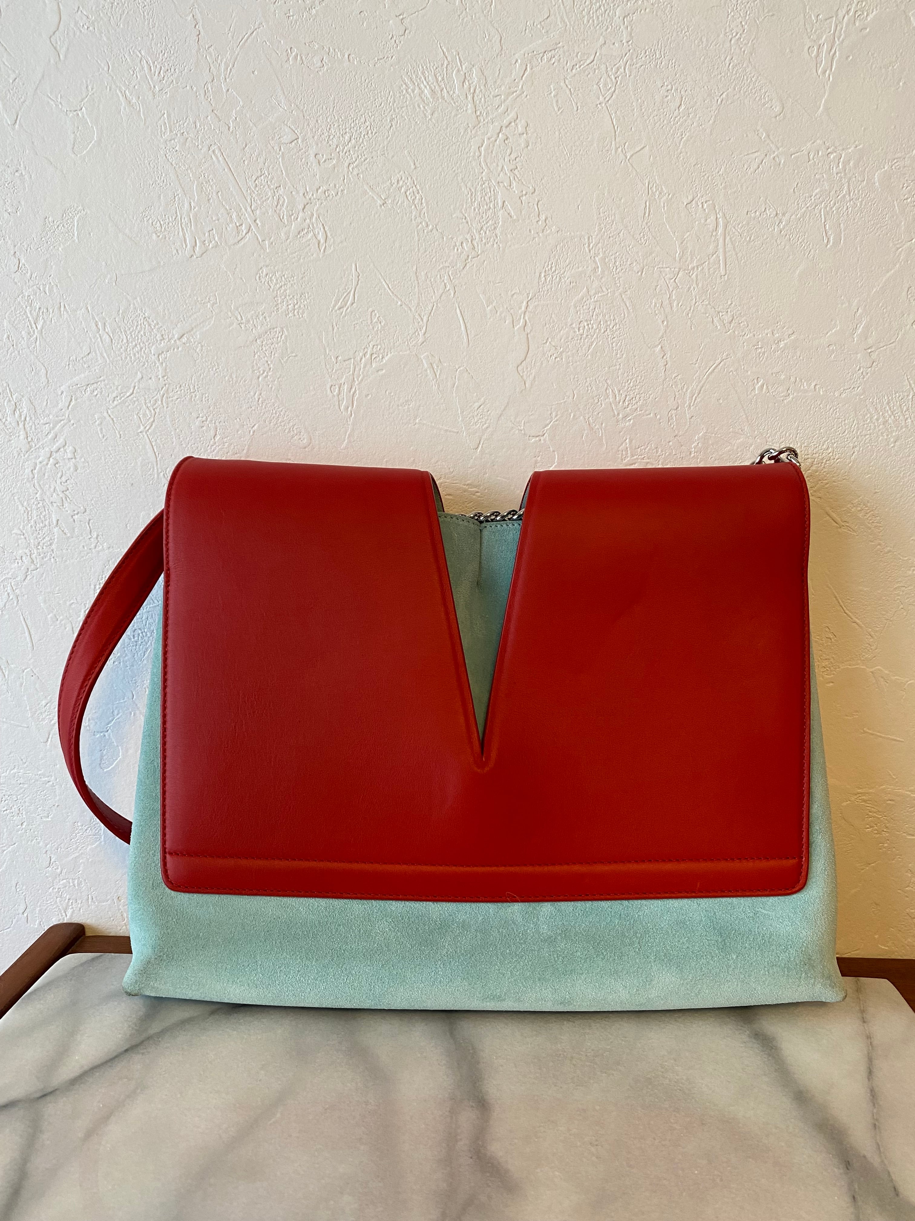 Jil Sanderのレザー×スウェードのチェーンショルダーバッグです。上品で洗練されたデザインが魅力の一品です。レッドとベビーブルーの2色展開で、どちらもコーディネートに華やかさをプラスしてくれます。クラッチバッグの様に持っても様になり、幅広いシーンで活躍してくれます。ショルダーのシルバーチェーンがよりスタイリッシュなデザインです。