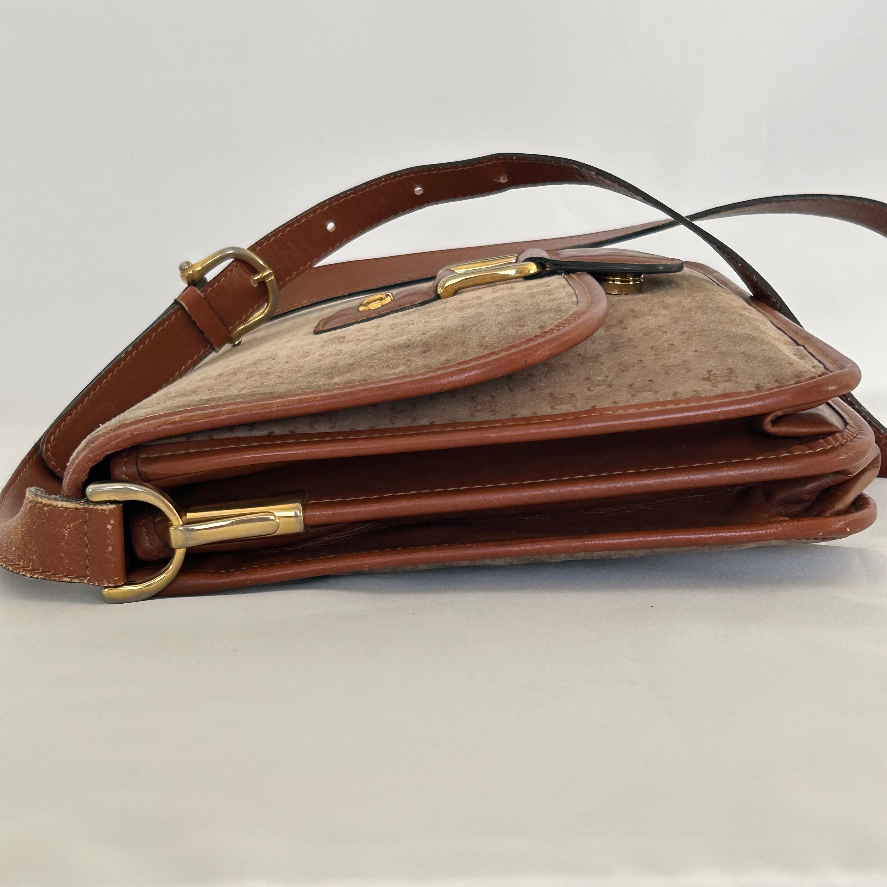 ベージュのスウェードとレザーが上品なショルダーバッグ。大きめなサイズ感なので容量も十分です。